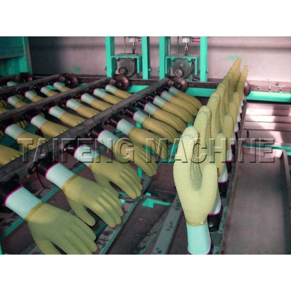 3、Special design of the elasticity of the piston mold connection device, mould replacement is simple, no off mold phenomenon. Labor insurance gloves production line adopts continuous production method and direct leaching method, uniform film-forming, colour and lustre is gorgeous, a variety of specifications can be online at the same time, production line length have 30 meters, 24 meters, 18 meters and so on.a High automation degree, large output, configurable demoulding automatically, Can be installed according to customer's production site design production line length.